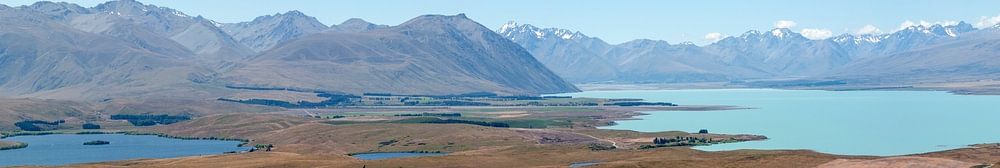 Lake Tekapo New Zealand View from the top of Mt John over the waters of Lake Alexanderina and Tekapo. Panorama image showing the different hues of blue of the two lakes.