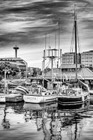 Idyllisch uitzicht vanaf Lake Union. Het is een zoetwatermeer binnen de stadsgrenzen van Seattle en vormt een belangrijk deel van het Lake Washington Ship Canal. Klassieke monochrome impressie.