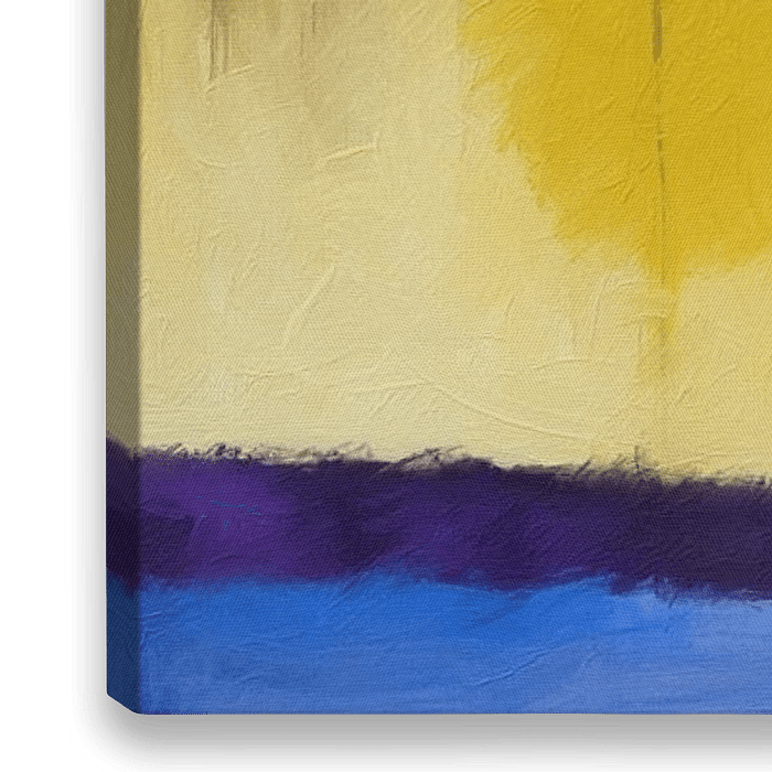 Levendige gele en gouden tinten domineren het bovenste gedeelte en suggereren een abstracte weergave van een bos, terwijl een contrasterende strook van blauw en paars aan de onderkant een gevoel van water introduceert. Het gebruik van kleurverlopen en silhouetten voegt een dromerige kwaliteit toe aan de scène en roept emoties en…