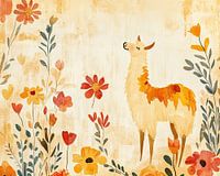 Lama Bloemen - Op dit schilderij zie je een lama die rustig staat tussen kleurrijke bloemen in warme tinten, wat een vrolijke en relaxte sfeer geeft.