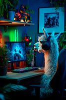 In een stijlvolle gameruimte zit een lama met een koptelefoon op gebiologeerd naar het scherm te staren. Omringd door weelderige planten en zachte neonverlichting is het decor bijna magisch. Het contrast tussen de dierlijke gamer en de technologie creëert een grappige, surrealistische sfeer die het alledaagse leven op charmante wijze op zijn kop zet.