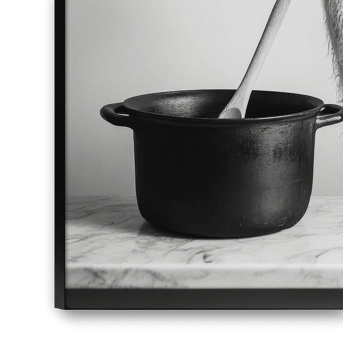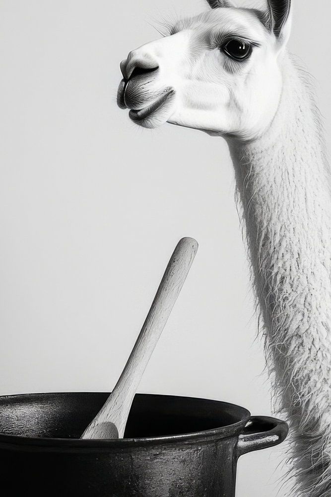 Een levendig moment vol humor schittert in zwart-wit: een nieuwsgierige lama kijkt met een roerlepel bot naar een waterkoker alsof hij een feestmaal aan het plannen is. Deze vrolijke, speelse compositie brengt een verfrissend tintje in de keuken en zorgt voor een glimlach terwijl je kookt!