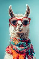 Deze charmante lama poseert met een duidelijk gevoel voor stijl, gedrapeerd in oogverblindende kleuren. De enorme rode zonnebril geeft hem een zorgeloze coolness, terwijl de kunstig gedrapeerde sjaal zijn speelsheid benadrukt. Een ongetwijfeld charismatisch wezen dat de zon laat schijnen met zijn opvallende look.