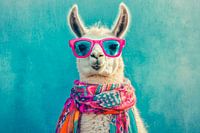 Met een coole zonnebril en een kleurrijke schildpadsjaal straalt deze charmante lama pure levensvreugde uit. Zijn zelfverzekerde uitdrukking in combinatie met de kleurrijke achtergrond creëert een vrolijke sfeer die doet denken aan een ontspannen dag in de natuur. Een onconventionele stijl die uitnodigt tot lachen!