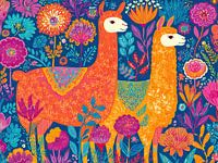 Lama's | Vrolijke Lama's Tussen Bloemen - Op dit dieren schilderij zie je twee kleurrijke lama's omgeven door vrolijke bloemen in diverse kleuren, met een levendige blauwe achtergrond die het geheel opfleurt.