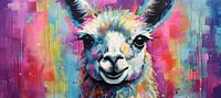 Lama - Dit levendige schilderij portretteert een kleurrijk gestileerde lama, centraal gepositioneerd tegen een achtergrond van abstracte, verticale kleurvlakken die in felroze, geel en blauwtinten overvloeien. De expressieve penseelstreken en de speelse spetters benadrukken het dynamische en moderne karakter van het kunstwerk.
