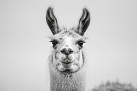 Dit zwart-wit portret van een lama fascineert door de gedetailleerde weergave en de charmante uitdrukking van het dier. De duidelijke contrasten en fijne details van de vacht geven de afbeelding een tijdloze elegantie. Dit kunstwerk is perfect voor liefhebbers van dieren en minimalistische kunst en geeft elke woon- of werkomgeving een rustig en stijlvol tintje.