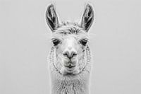 Dit zwart-wit portret van een lama fascineert door de gedetailleerde weergave en de charmante uitdrukking van het dier. De duidelijke contrasten en fijne details van de vacht geven de afbeelding een tijdloze elegantie. Dit kunstwerk is perfect voor liefhebbers van dieren en minimalistische kunst en geeft elke woon- of werkomgeving een rustig en stijlvol tintje.