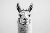 Dit zwart-wit portret van een lama fascineert door de gedetailleerde weergave en de charmante uitdrukking van het dier. De duidelijke contrasten en fijne details van de vacht geven de afbeelding een tijdloze elegantie. Dit kunstwerk is perfect voor liefhebbers van dieren en minimalistische kunst en geeft elke woon- of werkomgeving een rustig en stijlvol tintje.