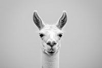 Dit zwart-wit portret van een lama fascineert door de gedetailleerde weergave en de charmante uitdrukking van het dier. De duidelijke contrasten en fijne details van de vacht geven de afbeelding een tijdloze elegantie. Dit kunstwerk is perfect voor liefhebbers van dieren en minimalistische kunst en geeft elke woon- of werkomgeving een rustig en stijlvol tintje.