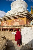 monnik draait gebedsmolens in het klooster van Lamayuru in Ladakh in noordwest India