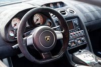 Lamborghini Gallardo Superleggera sportwagen dashboard. De Superleggera is een variant van de standaard Lamborghini Gallardo, die bekend staat om zijn lichtgewicht constructie, toegenomen vermogen en verbeterde rijeigenschappen. Het interieur van de Superleggera is ontworpen met de focus op sportiviteit en prestaties. Het heeft lichtgewicht kuipstoelen, koolstofvezel accenten en Alcantara bekleding.