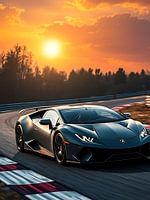 Koop de foto Lamborghini Revuelto Zwarte Zonsondergang Circuit 2 van MIROKKU op canvas, aluminium dibond, (ingelijste) fotoprint, behang en ArtFrame, op maat geprint in Fine-Art kwaliteit.