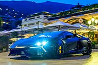 Lamborghini Revuelto high-performance supercar rijdt op het Casino plein in Monaco. De Revuelto is Lamborghini's eerste plug-in hybride HPEV (High Performance Electrified Vehicle) en is uitgerust met een 6,5-liter V12-motor en drie elektromotoren die samen 1.015 pk produceren. Foto met bewegingsonscherpte.