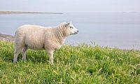Echt Texels plaatje, een lammetje op de Waddendijk. Het was een windstille dag, de Waddenzee was als een spiegel zo glad.
