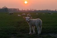 Een ontzettend schattig lammetje kijkt nog even om voor ze de zonsondergang te gemoed gaat rennen. Het is een ontzettend typisch hollands beeld en erg schattig.