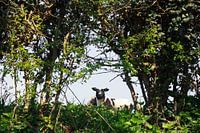Een zwart-wit lam gluurt door de heggen naar ons, op het Nederlandse bergpad bij Kruisbosch.