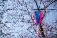 Kersenbloesems met lampion in Japan tijdens een zonnige dag met blauwe lucht in de lente of sakura seizoen. De bloem van deze bloesems is diep roze.
