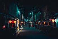 Sfeervolle lampionnetjes in een donkere straat in de Gion wijk, het Geisha district van Kyoto. Traditionele huizen in deze straat in Japan.