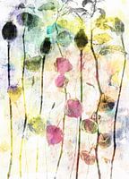 Schilderachtige impressie met lampionnetjes,papaverbollen en een gemengde techniek .
