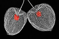 De geraamtes van twee lampionnetjes van de echte lampionplant (Physalis alkekengi) met opgedroogde vruchten erin. Macro opname tegen zwarte achtergrond.
