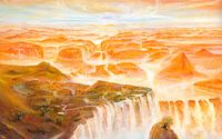 Links op de voorgrond komen donderende watermassa's onder een aardplaat vandaan, een opzienbarend tafereel dat de kijker meeneemt naar een wereld van surrealiteit en fascinatie. Dit element van onmogelijkheid creëert een magische sfeer en opent de deur naar een wereld waarin het ondenkbare mogelijk wordt.