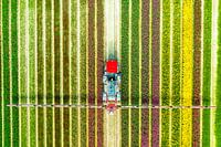 Agrarische onkruidspuiter in een tulpenveld in de Noordoostpolder in Flevoland, Nederland, in het voorjaar van bovenaf gezien. De Noordoostpolder is een polder in de voormalige Zuiderzee die aanvankelijk bedoeld was om meer land voor de landbouw te creëren.