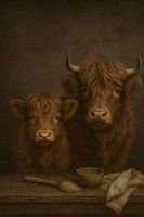 Een warm en sfeervol kunstwerk van twee Schotse Hooglanders, perfect voor een interieur in landelijke of sobere woonstijl. De ingetogen kleuren en zachte details brengen rust en karakter in elke ruimte.