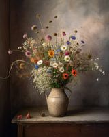 Landelijk en sfeervol stilleven met een veldboeket en een keramieken vaas. Een bijzonder mooie lichtval waardoor er een fijne sfeer ontstaan is.