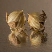 ""Landelijk in natuurlijke bruintinten: Samen zijn" is een macrofoto van twee zaaddozen van gedroogd vlas. Deze twee zaaddozen hebben prachtige natuurlijke bruine kleuren en de achtergrond (en ondergrond) zijn ook bruin van kleur. Het grondoppervlak is reflecterend en heeft een structuur, wat zorgt voor een abstracte weerspiegeling, wat net lijkt op een spiegeling in water. Dit geeft een mooi effect aan de foto. Als je inzoomt op de foto kun je dit goed zien!