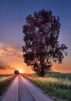 Landelijk landschap met veld, bomen en kleurrijke zonsondergang
