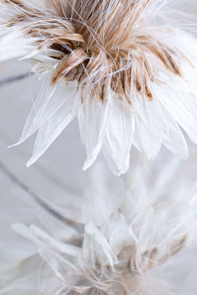 "Landelijk sfeertje: een klein droogbloemetje" is een macrofoto van een klein wit (creme) met beige bloemetje wat gedroogd is. Doordat het bloemetje op een wat spiegelende ondergrond ligt, zie je de reflectie van de bloem wat vervaagd terug in het grondvlak. Samen met wat pluishaartjes van dezelfde soort bloempjes.