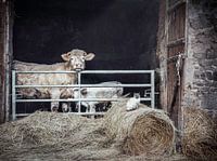 in deze prachtige foto van een koeienstal, genomen in het voorjaar in Frankrijk, zien we een idyllisch landelijke scène. Een moederkoe staat beschermend naast haar kalfje, beide koeien genieten van de rust in de stal. Naast de koeien zit een kat op een strobaal, zich koesterend in het zonnetje dat door een open deur naar binnen schijnt. De sfeer van de stal is rustiek en verweerd, wat bijdraagt aan de authentieke sfeer van deze landelijke natuur. Dit beeld straalt rust en harmonie uit, perfect passend bij het serene Franse platteland.