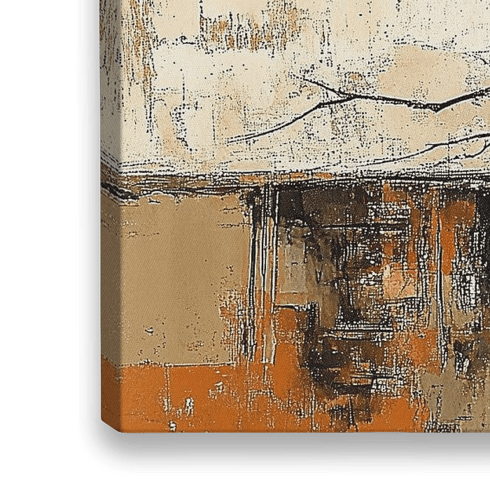 Dit kunst werk verbeeldt een sobere maar krachtige stilleven compositie, bestaande uit een boomtak met oranje sinaasappels, geflankeerd door twee antieke kruiken op een verfijnde wijze geplaatst tegen een verweerde achtergrond. Het beeld straalt een gevoel van serene tijdloosheid en verstilde schoonheid uit, en brengt de kijker terug naar een verloren gegane landelijke eenvoud.