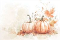 Breng de warmte van het najaar in huis met dit sfeervolle landelijke kunstwerk, geïnspireerd op de betoverende kleuren van de herfst. Centraal in dit schilderij staan sierlijke pompoenen in zachte oranje- en aardetinten, liefdevol geschikt en omringd door herfstbladeren.