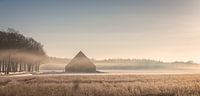 Een prachtig winters landschap, er lag nog sneeuw. En de zon was net, om de flarden grondmist te verjagen. De foto is genomen op 12 februari in Westerbork (Drenthe), in Nederland