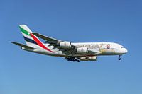 Over ‘Landende Emirates Airbus A380-800 met special livery.’ van Jaap van den Berg