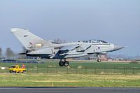 Een Panavia Tornado van de Royal Air Force vlak voor de landing op vliegbasis Leeuwarden gefotografeerd.