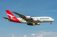 Koop de foto Landende Qantas Airbus A380 passagiersvliegtuig. van Jaap van den Berg op canvas, aluminium dibond, (ingelijste) fotoprint, behang en ArtFrame, op maat geprint in Fine-Art kwaliteit.
