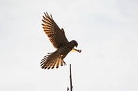 Torenvalk (Falco tinnunculus) gaat landen op een stok, bij laagstaande zon. Doordat de zon al laag stond, kijk je bijna door de nog uitgespreide staart en vleugels heen. Het is een serie van drie die allemaal op Werk aan de Muur staan.