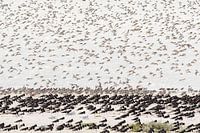 Kanoeten landen op een gezamenlijke rustplaats, bij de scholeksters.