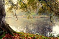 Op het landgoed De Braak in Paterswolde vind je een aantal grote vijvers. Dit is er één van tijdens de herfst, die je ziet in een doorkijkje van een boom met overhangende takken.