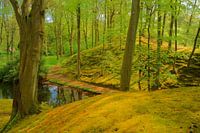 Foto van een mooi groen beukenbos op Landgoed Elswout, Overveen, Noord-Holland. De bomen staan net in blad in de lente en het mos in dit loofbos is geelgroen van kleur.
