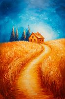 Een rustig pad baant zich een weg door gouden velden die gloeien in het warme zonlicht. Een charmant geel huis staat alleen onder een brede blauwe hemel die de vredige eenzaamheid omlijst. Dichte bomen aan de zijkant voegen leven toe aan het landschap en onontdekte geheimen die wachten om ontdekt te worden.