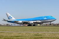 Deze jumbo jet van de KLM heeft net haar landingsgestel op het asfalt van 1 van de start- en landingsbanen van luchthaven Schiphol gezet.