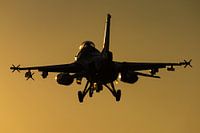 Een F-16 gevechtsvliegtuig gaat landen tijdens zonsondergang. De F-16 Fighting Falcon is een eenmotorige multifunctionele straaljager die sinds 1979 veel gebruikt wordt. In onder andere Nederland en België was het de opvolger van de F-104 Starfighter.