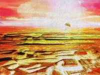 Een digitaal schilderij dat de landing verbeeldt van de Europese ruimtesonde Huygens in 2005 op Titan, de grootste maan van Saturnus. Titan is een bizarre wereld met een dikke atmosfeer en meren van vloeibaar methaan. Een exotisch landschap waar tussen de wolken nog vaag de planeet Saturnus met zijn ringen te zien is.