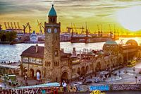 Zonsondergang bij de landingsplaatsen in Hamburg, Duitsland.