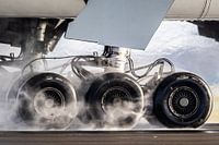 Landingsgestel van Boeing 777 met spray van een natte polderbaan bij Schiphol Airport.