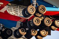 Landingsgestel van Emirates A380 Expo livery. Gratis reclame voor Michellin.